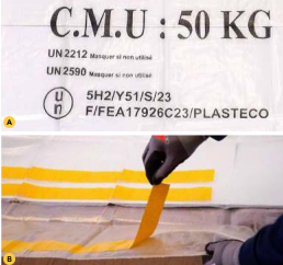 Utilisable pour le transport de déchets amiantés non soumis à l’ADR, notamment selon la « DS 168 »4DS 168 : L’amiante immergé, ou fixé dans un liant naturel ou artificiel (ciment, matière plastique, asphalte, résine, minéral, etc.), de telle manière qu’il ne puisse pas y avoir libération en quantités dangereuses de fibres d’amiante respirables pendant le transport, n’est pas soumis aux prescriptions de l’ADR. Les objets manufacturés contenant de l’amiante et ne satisfaisant pas à cette disposition ne sont pas pour autant soumis aux prescriptions de l’ADR pour le transport, s’ils sont emballés de telle manière qu’il ne puisse pas y avoir libération en quantités dangereuses de fibres d’amiante respirables au cours du transport. , avec masquage obligatoire des étiquettes de danger et des codes ONU 2212 et 2590 par l’emballeur.